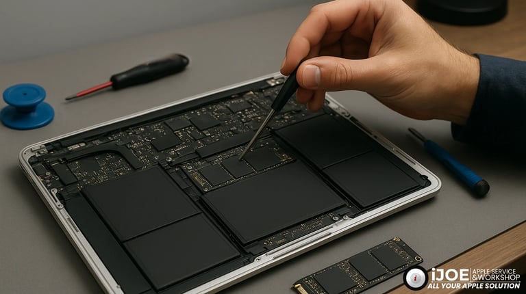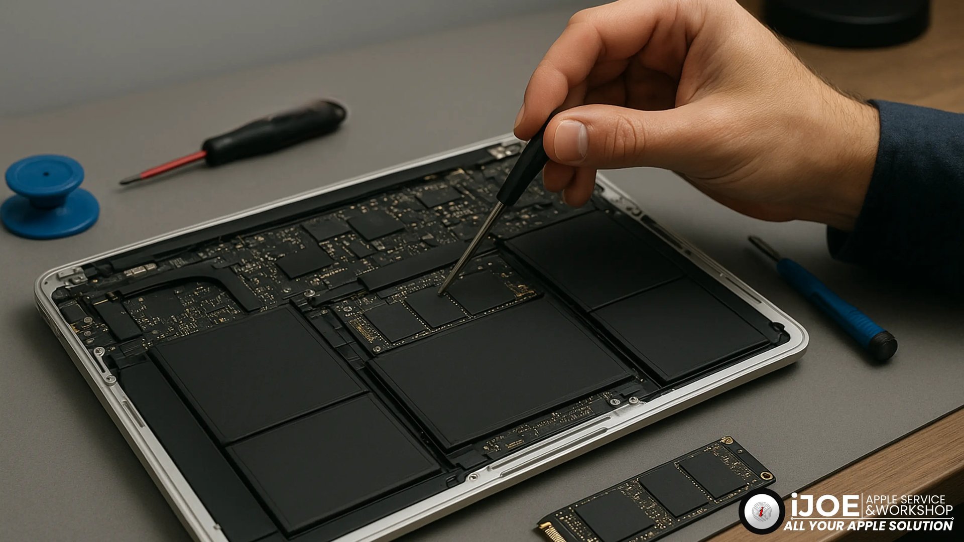 Di iJOE Apple Service, teknisi menggunakan alat profesional dan metode aman, sehingga reparasi SSD atau harddisk dapat dilakukan tanpa merusak logic board atau komponen internal lain.