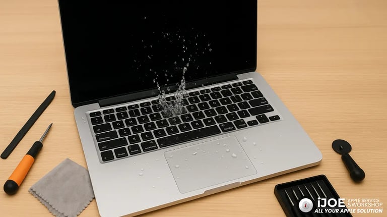 Jadi, kalau suatu hari kopi, teh, atau air mineral nggak sengaja menumpahi MacBook-mu, jangan buru-buru putus asa.