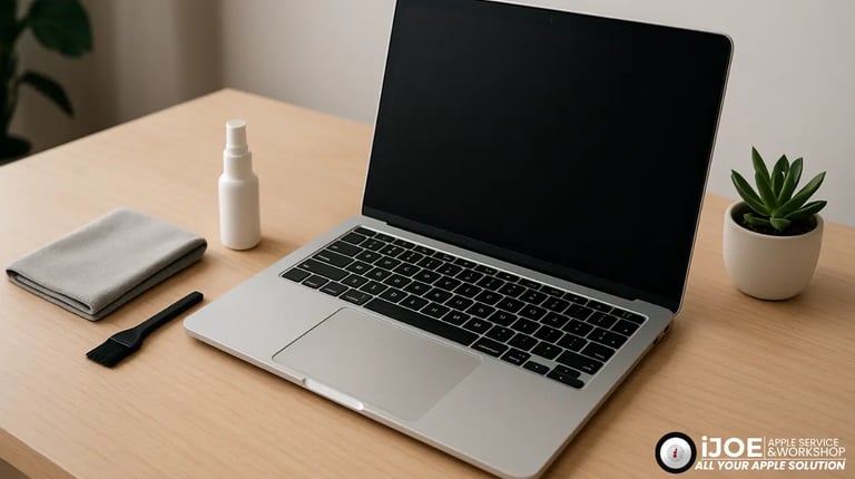 Gunakan blower mini atau compressed air untuk membersihkan sela-sela keyboard. Jangan semprot air, ya. Kalau mau lebih maksimal, kamu bisa bawa ke iJOE Apple Service, karena di sana pembersihan dilakukan dengan alat khusus dan cairan aman untuk sirkuit Apple.